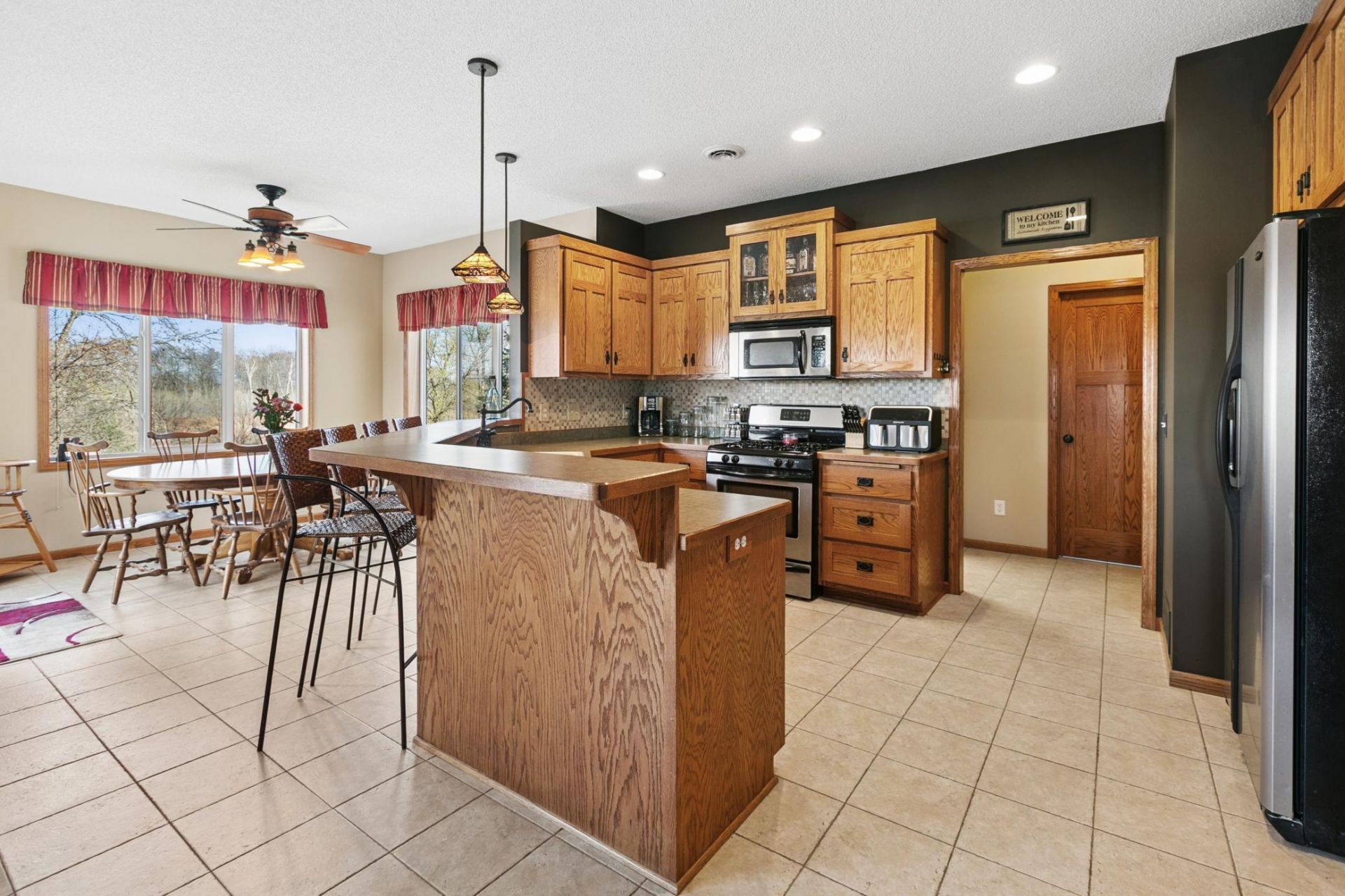 This beautifully maintained two-story home in the Lakes of Blaine offers an inviting open floor plan on the main level, filled with natural light and featuring cozy fireplaces on both the main and lower levels. The spacious upper-level loft adds versatile living or work space, complemented by three bedrooms that provide comfortable accommodations. The vinyl exterior with a charming brick front creates attractive curb appeal, featuring a freshly stained large deck ideal for savoring serene views of the adjoining Blaine Wetland Sanctuary?a natural buffer with no homes behind?where abundant local wildlife thrives.Set on a generous lot plus an adjacent open city lot, the property boasts ample outdoor space highlighted by a raised garden bed, a sprinkler system, and peaceful surroundings. Inside, ceramic tile flooring spans the main floor and bathrooms, while new carpeting enhances the stairs and upper level. The kitchen is outfitted with stainless steel appliances and most rooms feature top-down bottom-up shades for optimal light control and privacy.Additional standout amenities include a finished workshop above the three-stall garage with custom cabinetry for 32 bins, a sink, pneumatic plumbing, and heater rough-in, perfect for hobbies or projects. Thoughtful updates from 2019 encompass a new roof, vinyl siding, gutters, and garage doors, alongside fresh paint on the main and upper levels. Energy-efficient solar panels on the roof help minimize electric bills, supporting sustainable living.Enjoy peaceful, natural surroundings just steps from Lakeside Commons Beach, where tranquil walks and local wildlife sightings of deer, pheasants, rabbits, turkeys, ducks, and squirrels enrich everyday living. This home perfectly blends modern amenities, thoughtful upgrades, creating an exceptional retreat in a vibrant community.