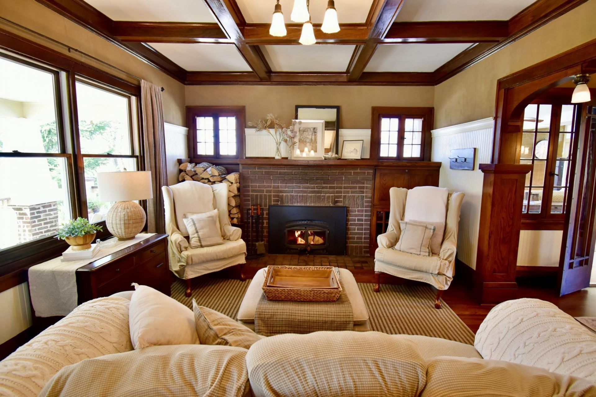 Timeless charm of yesteryear abounds in this 1922 Mission Style Arts & Crafts period home. The stately pillars welcome you as you walk towards the Douglas fir wood entry door with Prairie-style glass. Built by craftsmen of Dassel, MN, where their craftsmanship is evident throughout this unique home. Nestled on nearly 3 acres of rolling hills and majestic oak trees surrounds this home, providing a serene setting along with deeded access to Lake Erie just behind the property. Stroll down the lake access trail which you can put in your own dock for a boat or canoe. Enjoy morning breakfasts or coffee on your front porch. Or in the afternoon, relax on the south-facing deck, enjoying the warm afternoon sunshine. Fall and Winter is where this home really shines. The hearty, warm tones of brown & olive brick of the wood-burning fireplace provide a focal point as well as cozy warmth for the living and dining rooms. Flanked by a mission-style bookcase and seating in an inglenook. The installed stainless steel fireplace insert with built-in fans provides plenty of warm enjoyment through the winter months. Home boasts beautiful quarter-sawn white oak hardwood floors in the main living & dining rooms, as well as built-ins and boxed-beamed ceilings, which adorn this 5 BR, 3 bath home. The large walkout basement with 9 ft ceilings and in-floor heat provides a great mother-in-law suite with a full kitchen with solid surface countertops, a full bathroom, Bedroom with natural light from the two large windows. A bonus 12 x 12 Room with a bank of interior French doors to make into your own office or workout room.Additional Features Include: High-performance Trane® Furnace with dual fuel off-peak electric backup plenum heater, Silestone® countertops, Jenn-Air stainless steel appliances, Malarkey® 50-year Impact-resistant architectural shingles, A 24 x 26 2-car insulated garage with a gas heater and an efficient insulated 16 ft premium wood-grained garage door, plus a 16x20 storage shed, are some of the latest upgrades. This home harmonizes beautifully in this country setting with the warmth of this family home, with modern conveniences and comforts.